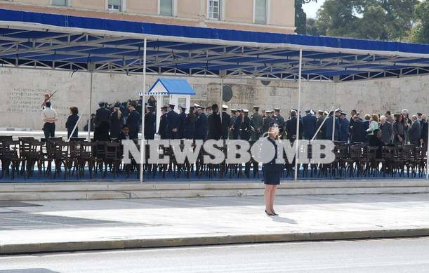 Στην εξέδρα των επισήμων, η οποία δεν είναι υπερυψωμένη βρίσκονται μεταξύ άλλων ο υπουργός Παιδείας Αριστείδης Μπαλτάς και ο Δήμαρχος Αθηναίων Γιώργος Καμίνης.
