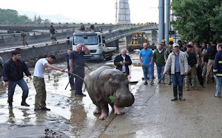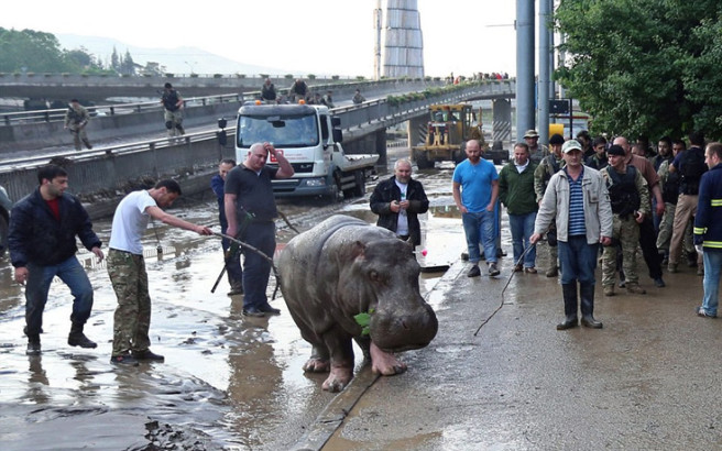 Στα πλάνα φαίνεται κι ένας ιπποπόταμος να περιφέρεται μεταξύ αυτοκινήτων στην κεντρική πλατεία της Τιφλίδας. Τελικά ναρκώθηκε και ακινητοποιήθηκε.
