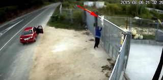 Δεν τα καταφέρνει όμως. Στη συνέχεια σκαρφαλώνει στο φράχτη και καταφέρνει να πετάξει το σκύλο του. Δίπλα του ακριβώς στέκεται και ένας άλλος άνδρας που μόλις έχει κατέβει από το αυτοκίνητο.