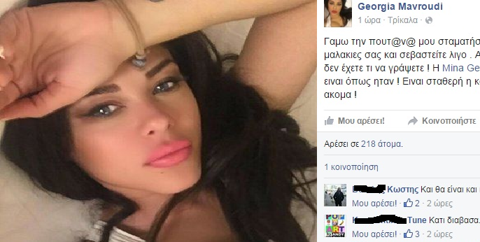 Μάλιστα, στην προσπάθειά της να διαψεύσει τα δημοσιεύματα περί άσχημης κατάστασης της Μυρσίνης, η Γεωργία Μαυρουδή αποκαλύπτει πως "Η Mina Gemini Arnaouti δεν εχει καμια επιπλοκή ειναι όπως ηταν"!