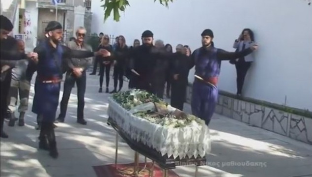 Εκεί, σε ένα συγκινητικά φορτισμένο κλίμα, χορευτές του Ομίλου Βρακοφόρων Κρήτης, ως ένδειξη τιμής χόρεψαν γύρω από το φέρετρο του μεγάλου λυράρη, με τους καλλιτέχνες Κώστα Κακουδάκη, Μανώλη Βερνιδάκη και Γιώργο Νηστικάκη να παίζουν κρητική μουσική.