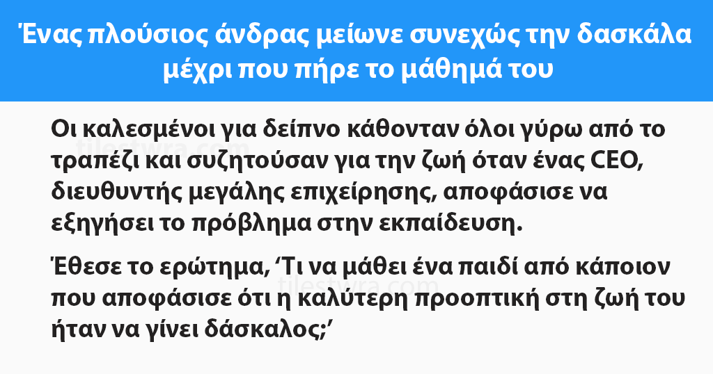 Οι καλεσμένοι για δείπνο κάθονταν όλοι γύρω από το τραπέζι και συζητούσαν για την ζωή όταν ένας CEO, διευθυντής μεγάλης επιχείρησης, αποφάσισε να εξηγήσει το πρόβλημα στην εκπαίδευση. Έθεσε το ερώτημα, ‘Τι να μάθει ένα παιδί από κάποιον που αποφάσισε ότι η καλύτερη προοπτική στη ζωή του ήταν να γίνει δάσκαλος;’