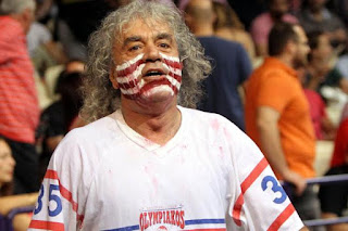 Ο γνωστός οπαδός των Ερυθρολεύκων είδε όλο το παιχνίδι ακριβώς πίσω από τη μία μπασκέτα του παρκέ, ενώ πολλές φορές η κάμερα τον έπιασε είτε να πανηγυρίζει έξαλλα στα καλάθια της ομάδας του, είτε να τα χώνει στους αντιπάλους.